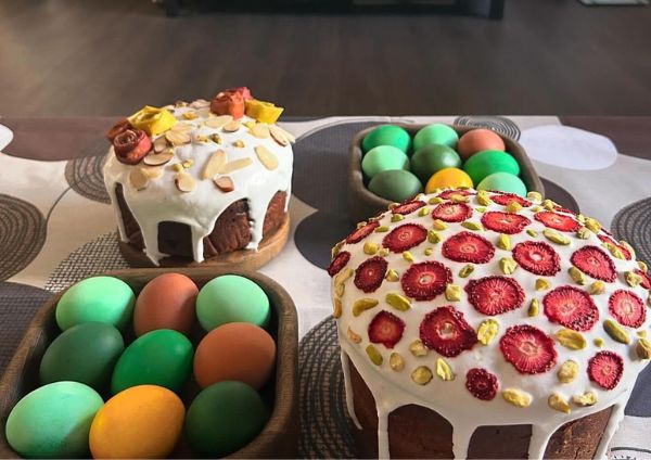 Біля входу літерою «П» стояли довгі дерев’яні столи. А довкола них юрбилися люди. На столах у красивих кошиках стояли рум’яні паски й лежали крашанки. У кого не було кошика — розставляли своє добро прямо в пакетах чи якихось картонних коробках.